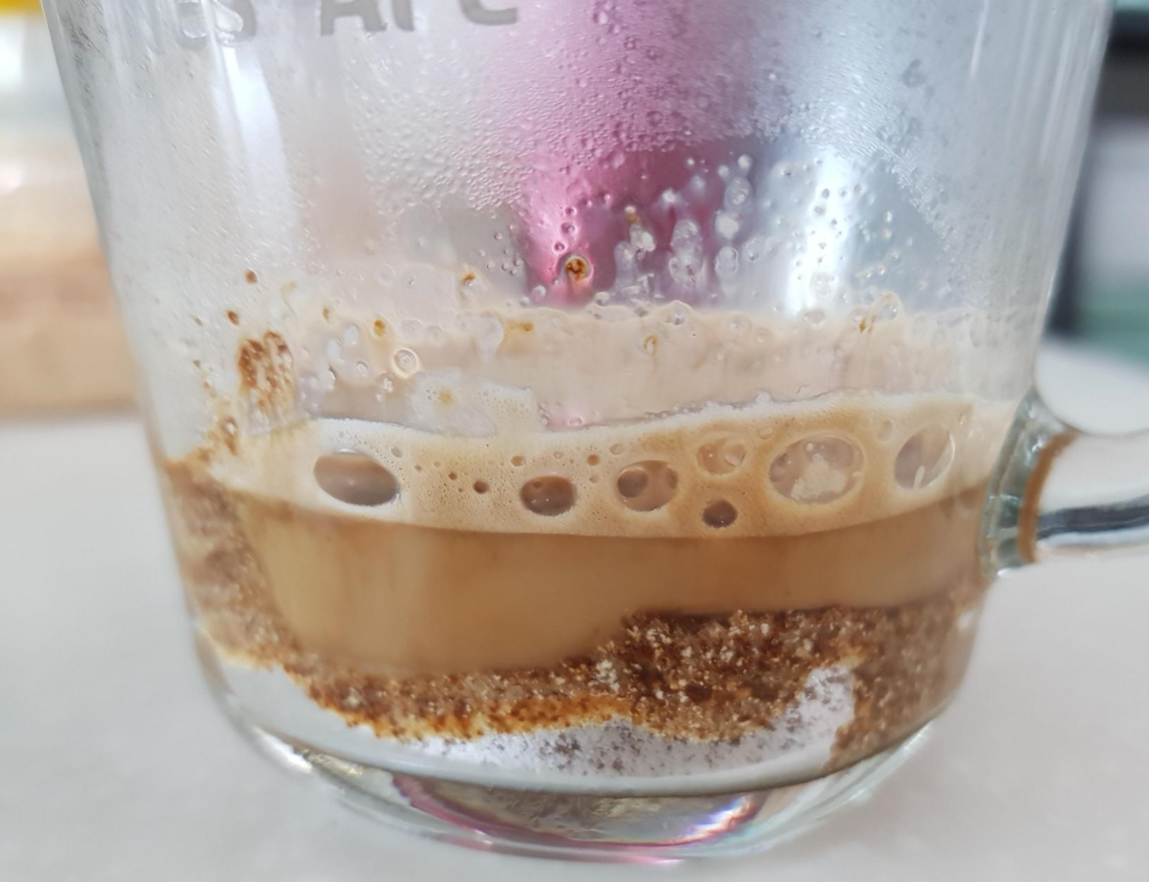 다 섞고 난 뒤 표면의 거품에서 차이가 느껴지는데 할리스 바닐라 딜라이트 쪽을 좀 더 뒤에 섞어 줬더니 거품이 덜 만들어진 것 같습니다.